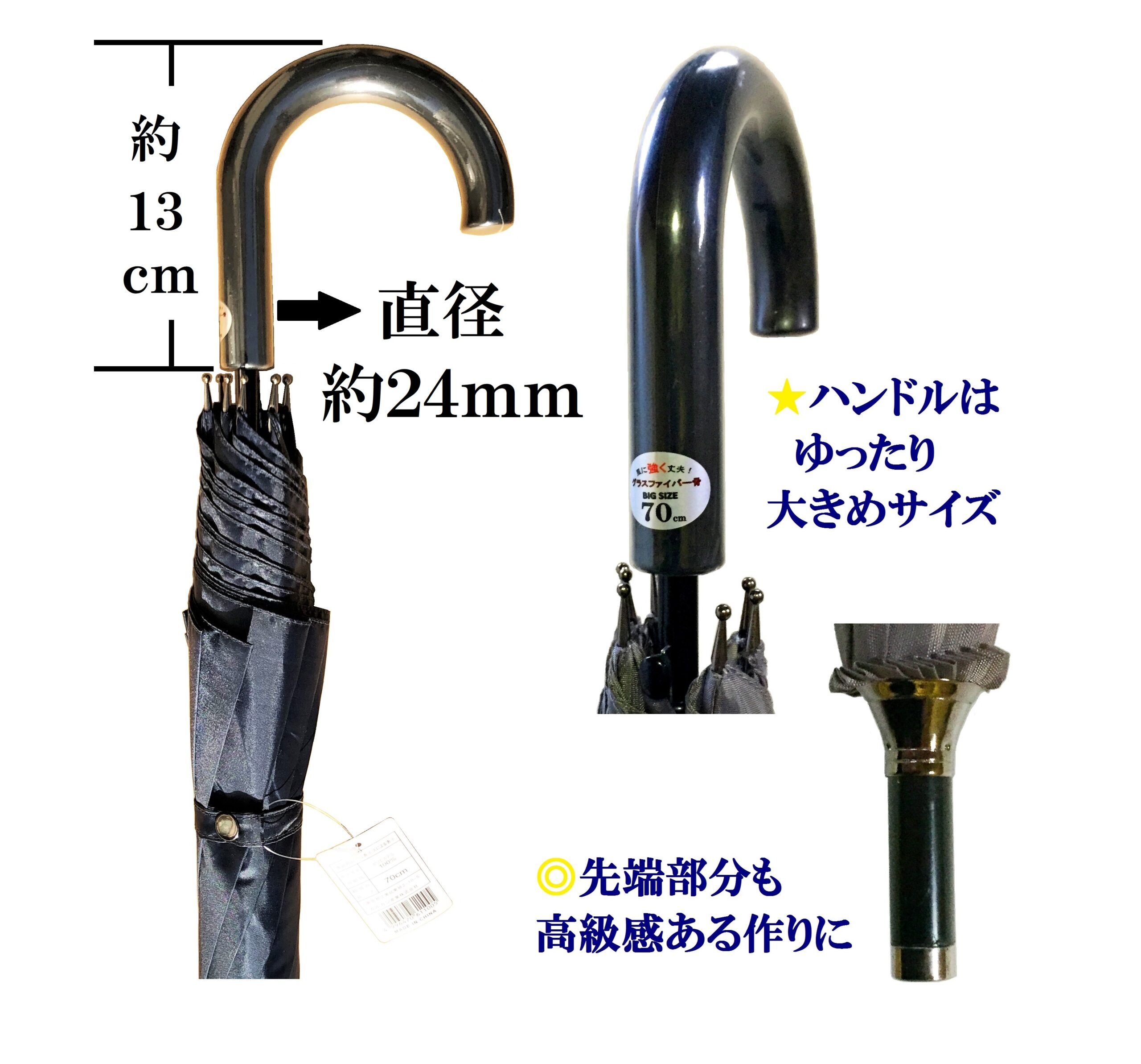 シート部分:ポリエステル ハンドル・先部分:プラスチック 骨:中棒/受け骨部分⇒スチール(黒電着)8本骨、親骨⇒グラスファイバー素材 開閉方式:ジャンプ式 ネーム仕様:ボタンタイプ
