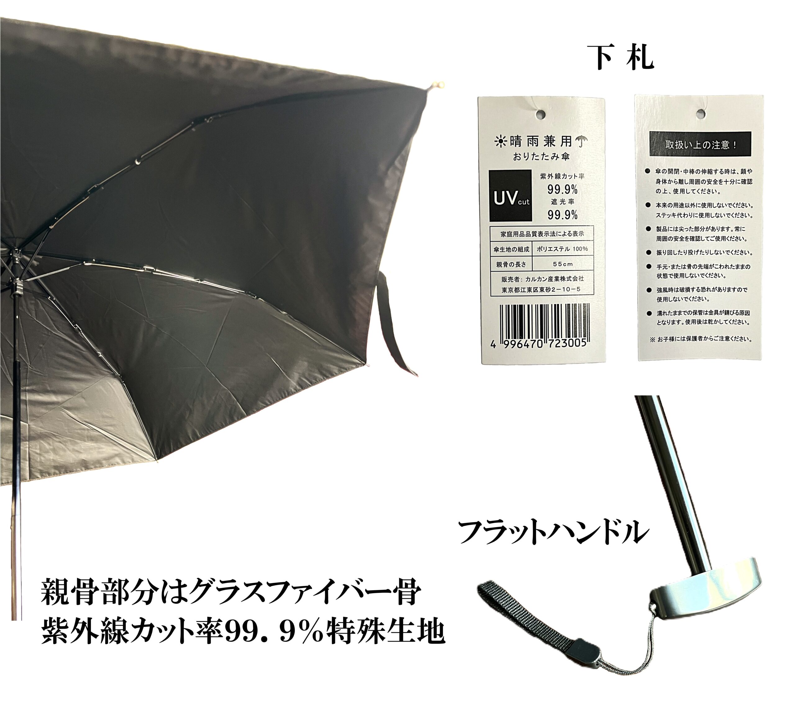 シート部分:ポリエステル ハンドル・先部分:プラスチック 骨:シャフト部分 アルミ(黒電着) 親骨部分 スチール・グラスファイバー(6本骨) 開閉方式:手開き式 ネーム仕様:マジックテープタイプ