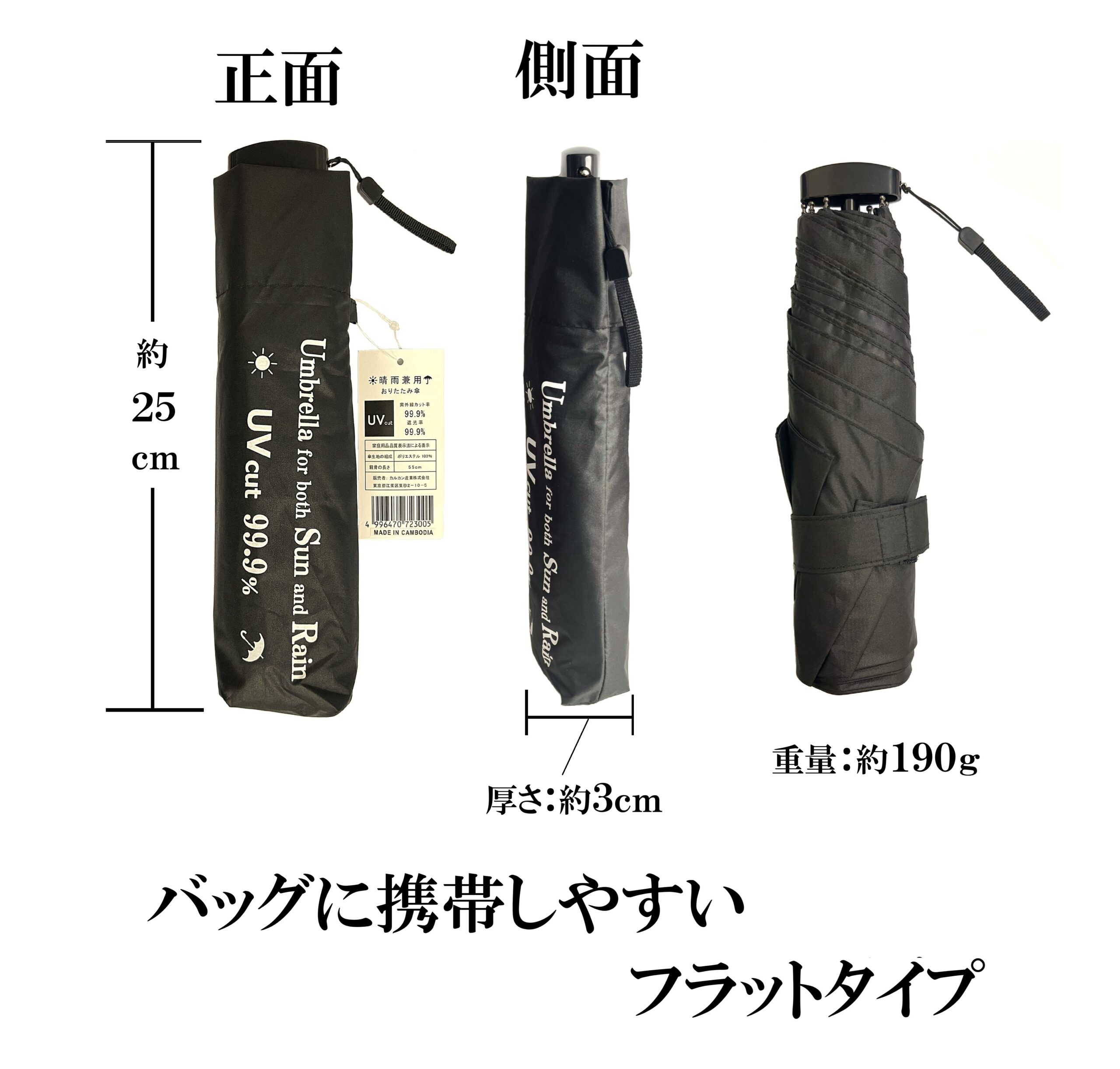 ◎1本のサイズ・重量 全長:約25cm(折畳み時)開いた直径:約99.0cm ◎1箱のサイズ・重量 約33×29×35cm(縦×横×高さ) 重量(G.W.)約12.35kg |