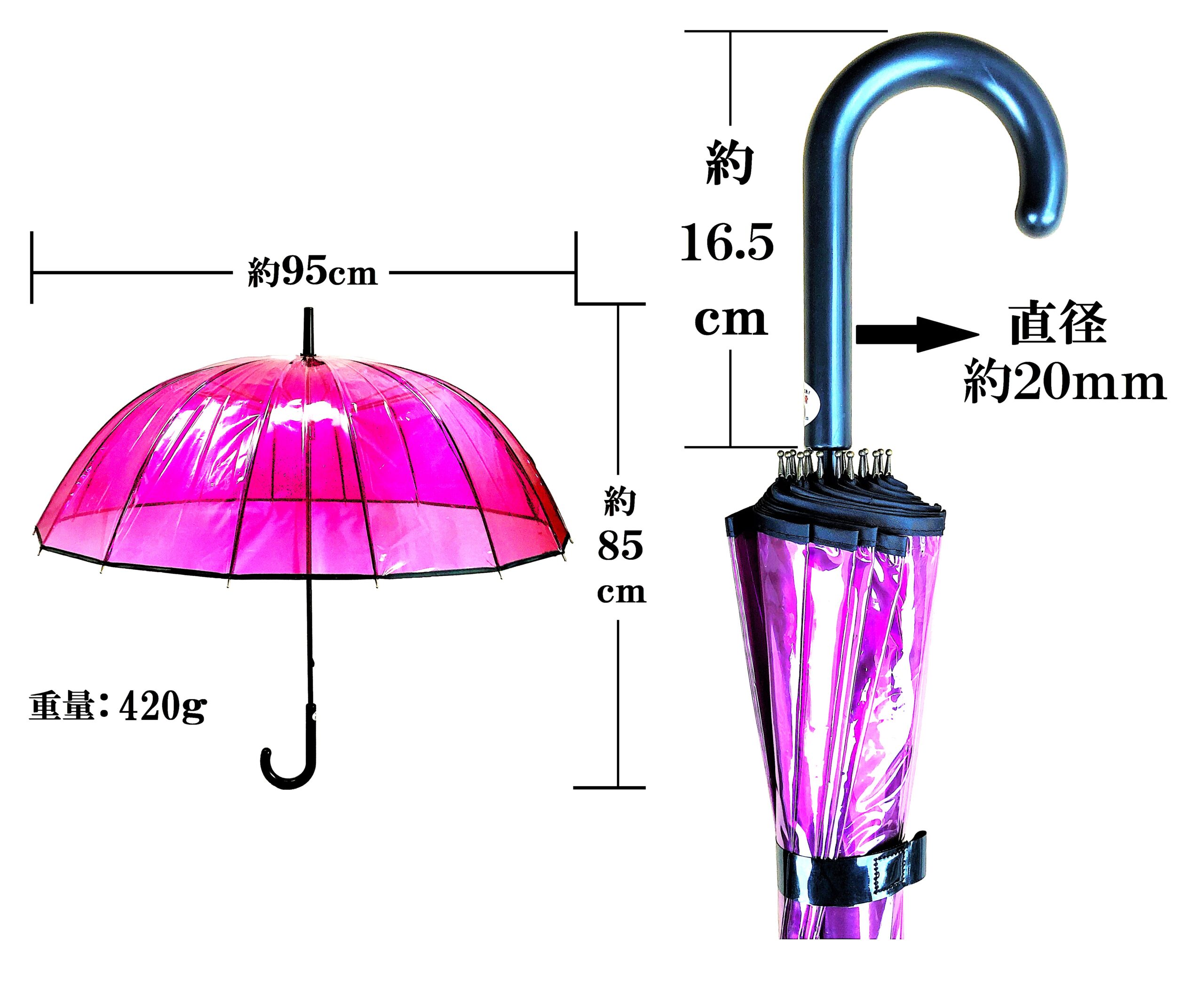 ビニール部分色:ポリエチレン ハンドル・先部分:プラスチック 骨部分:スチール(黒電着) 淵部分:ポリエステル(パイピング加工) 開閉方式:手開き式 ネーム仕様:マジックテープタイプ ロクロ部分:ロクロカバー付 |